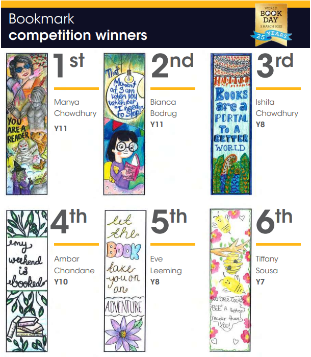 At the end of March we held our annual World Book Day, Bookmark Competition. The winners and runners-up designs will be made into a bookmark available in the Library from September and also given to all new Year 7 students.