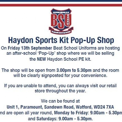 Our new Sports Uniform Supplier will be Beat School Uniforms - they will be holding a pop up shop on Friday 13th September – find out more here :
