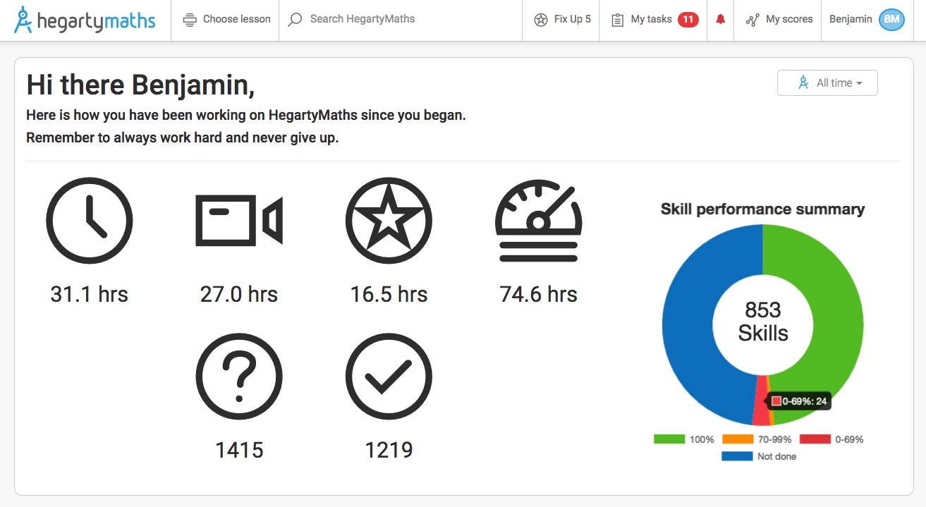 - Their home page, here you can see their personal donut. Blue represents skills not done, Red represents skills they achieved below 70%, Amber represents skills they have achieved above 70% and green represents skills they have completed 100%. On their homepage you can also see how long they have been spending on the tasks, watching videos, as well as fix up 5